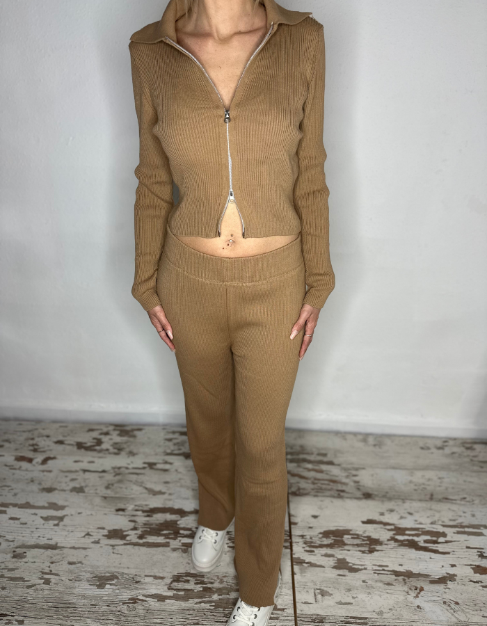Chandal punto marron con cremallera y pantalon con cintura elastica y mini abertura lateral .